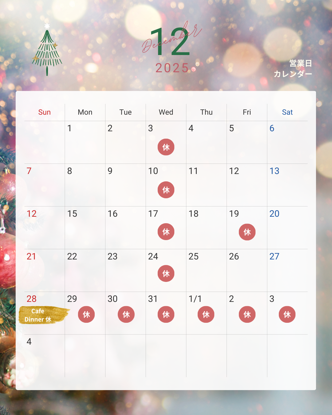 今年も残りわずかとなりましたが、12月も変わらぬお引き立てのほど